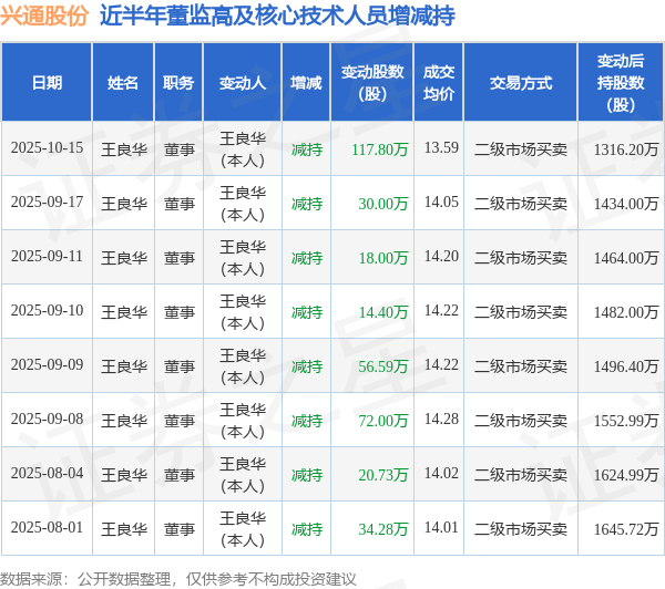 证券之星消息,根据10月16日市场公开信息、上市公司公告及交易所披露数据整理,兴通股份(603209)最新董监高及相关人员股份变动情况:2025年10月15日公司董事王良华共减持公司股份117.8万股,占公司总股本为0.3625%。变动期间公司股价下跌0.81%,10月15日当日收盘报14.75元。
