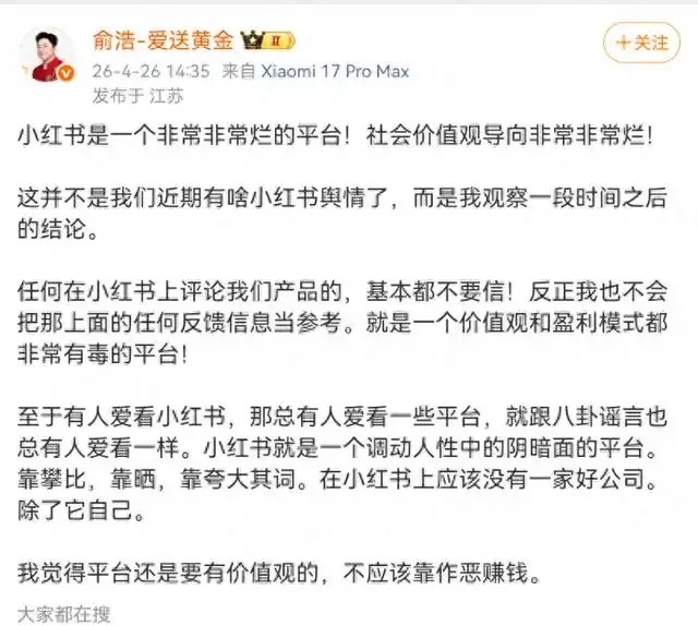 4月26日,追觅科技CEO俞浩发文“炮轰”小红书称,小红书是“一个非常非常烂的平台”,其社会价值观导向“非常非常烂”。他强调,这一结论并非源于近期舆情事件,而是长期观察后的判断。